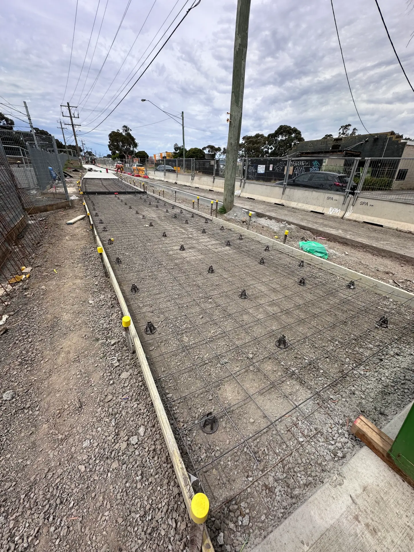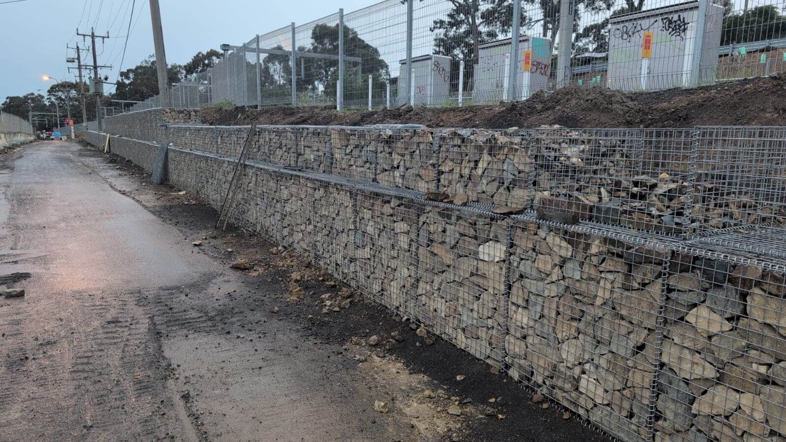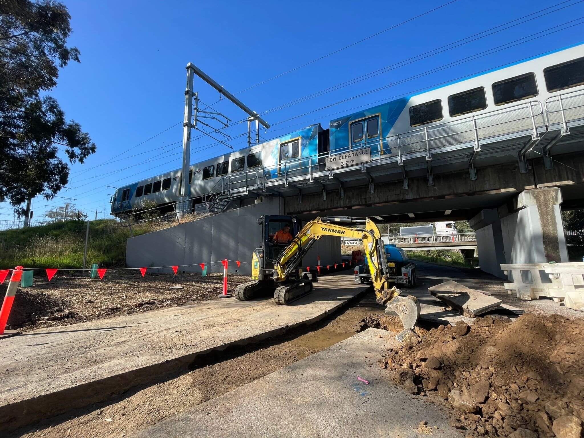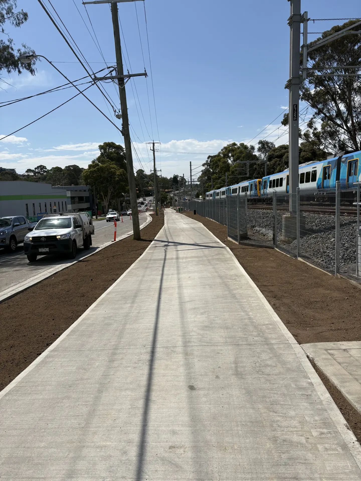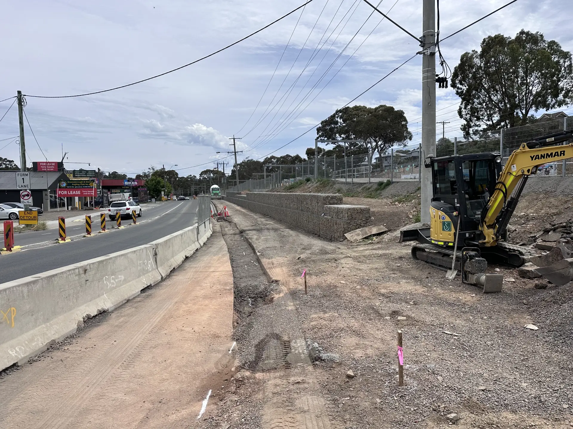 Construction of new shared use path along Para Road in Greensborough including construction of new gabion basket retaining walls and relocation of PTV bus bay under traffic management in narrow corridor between arterial roadway and metro railway lines.